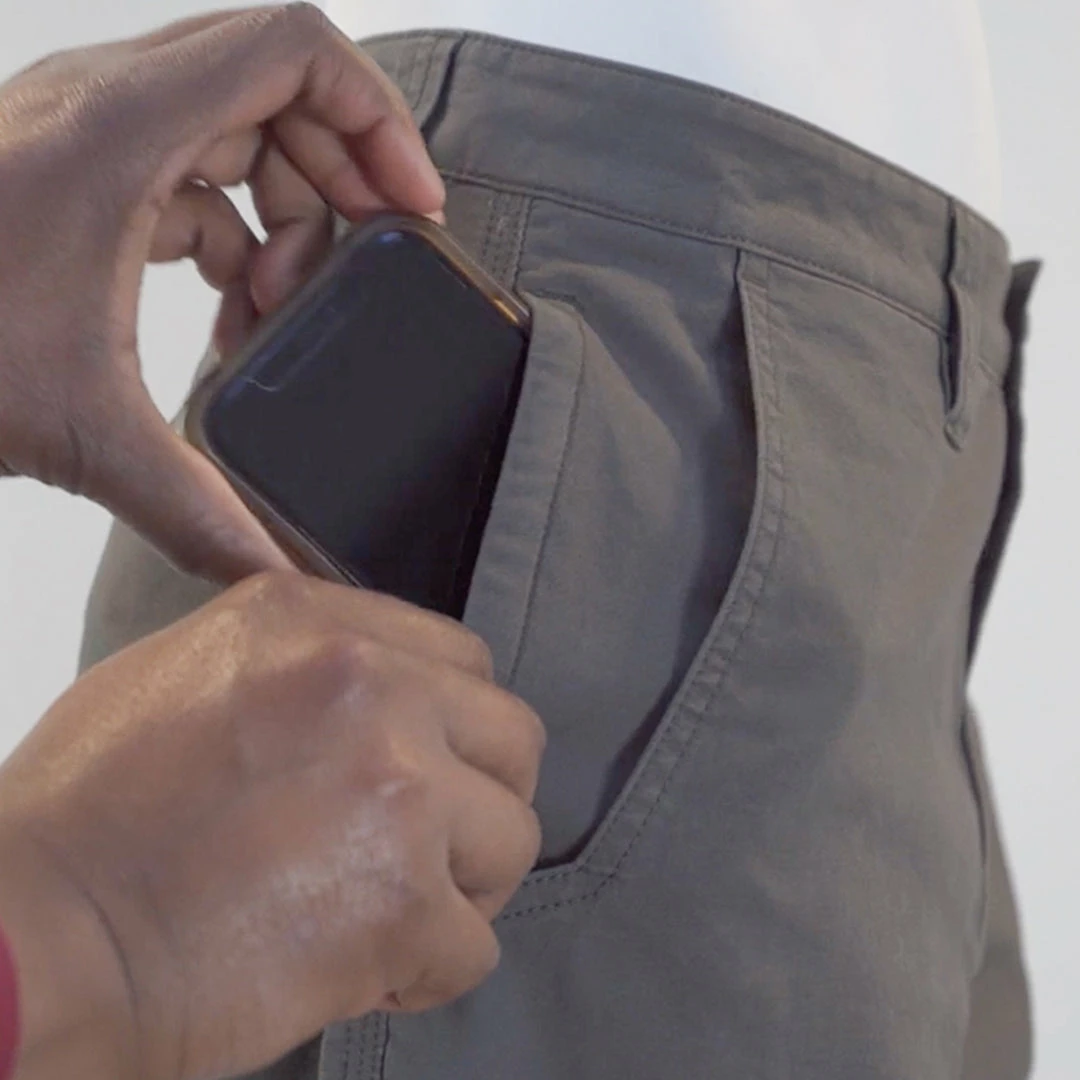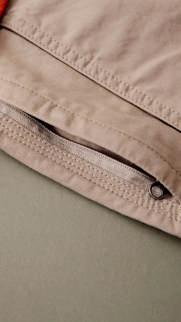 - Hidden side seam deep drill hand pocket with zipper closure for added security