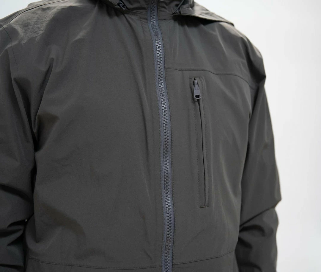 - 3 pockets: 1 chest pocket with zipper closure and hand pockets