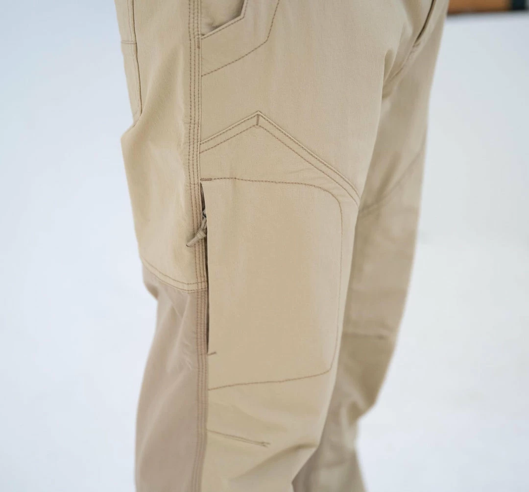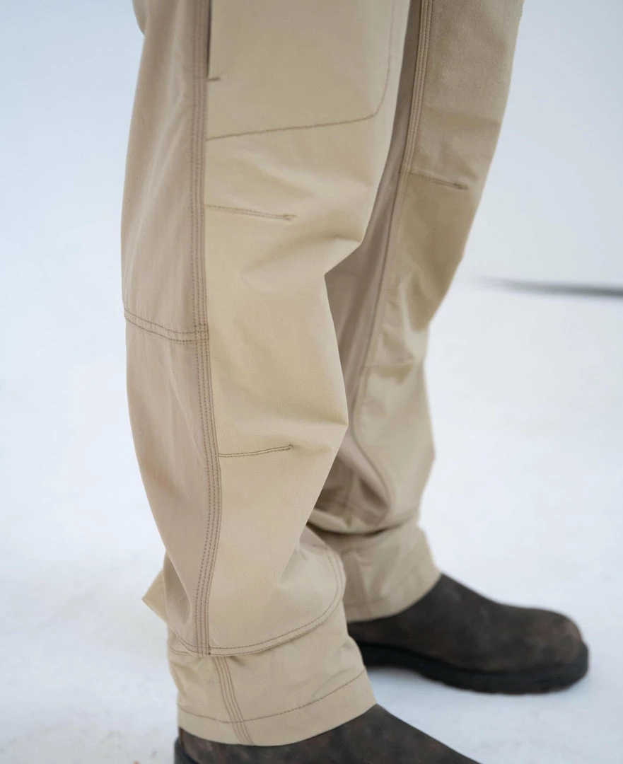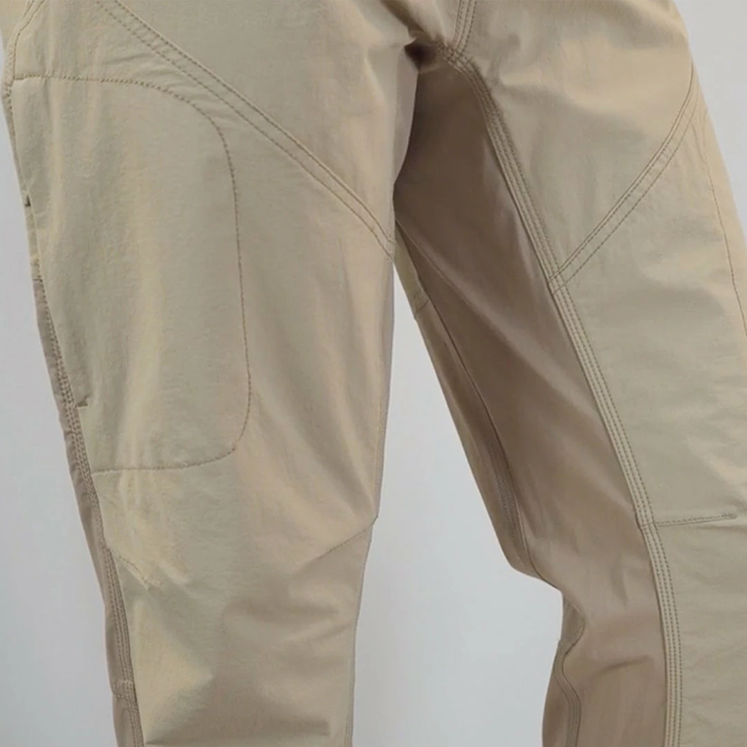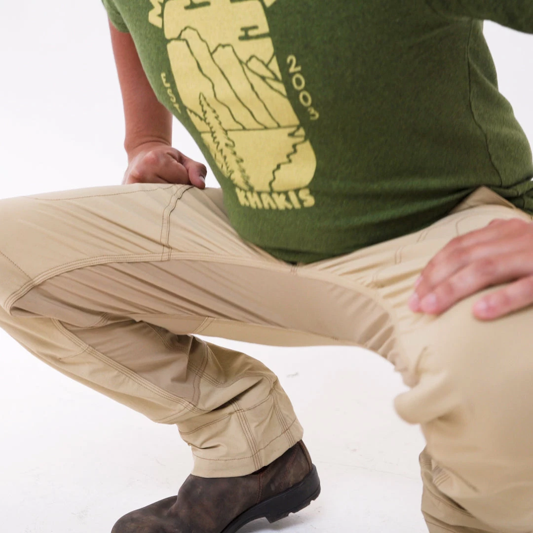 As the name implies, this pant is going places: we designed this one for climbing and chasing trails. As one of our most technical products, it’s loaded with premium fabrics and features. At 4.8oz the fabric is a cool, breathable nylon and is lightweight so it won’t slow you down. The nylon/spandex 4-way stretch makes up the majority of the pant with a bonus hybrid contrast fabric in key locations for the perfect blend of durability and mobility. Inherent attributes of nylon include stretch and elasticity, resistant to tears and abrasions, and rugged durability. The 4-way stretch piecing contains DWR to keep you dry. We’ve included a built-in webbing adjuster to make sure you get a secure waist fit no matter the circumstance. You’ll find some of our best signature features finishing off this pant including angled, deep drill hand pockets, side seam thigh pockets with zipper closures, an action gusset and knee articulation for comfort and mobility, triple-stitched seams & bar-tac reinforcements and hook & loop on the hem cuff to secure better around your footwear for added protection from the elements.