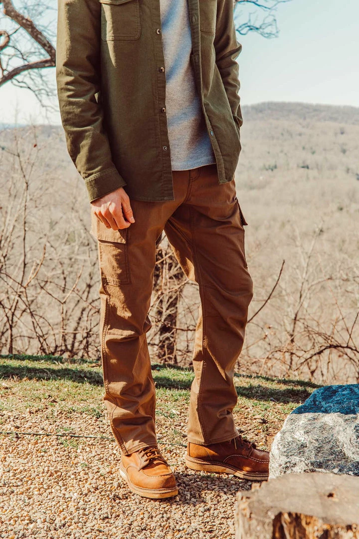 Meet the swiss army knife of pants. This cotton/nylon/spandex blend pant offers 10 pockets and is built for versatility. The versatility and strength of the fabric of the Cavern Pant means it can be used for a variety of purposes – and best of all, itโs easy-care and wrinkle-resistant, so it comes out of the dryer or suitcase ready to wear. Letโs talk pockets. Two front angled deep drill hand pockets, one hidden side seam deep drill hand pocket with zipper closure for added security, an extended knife or utility pocket on your right, two back pockets, and four pockets on the thighs including low-profile cargo pockets with hidden snap closure and hidden double entry utility pockets. An action gusset and knee articulation add to this pant’s all-around comfort and mobility. Triple stitched seams, bar-tack reinforcements and double layer heel cuffs for durability.