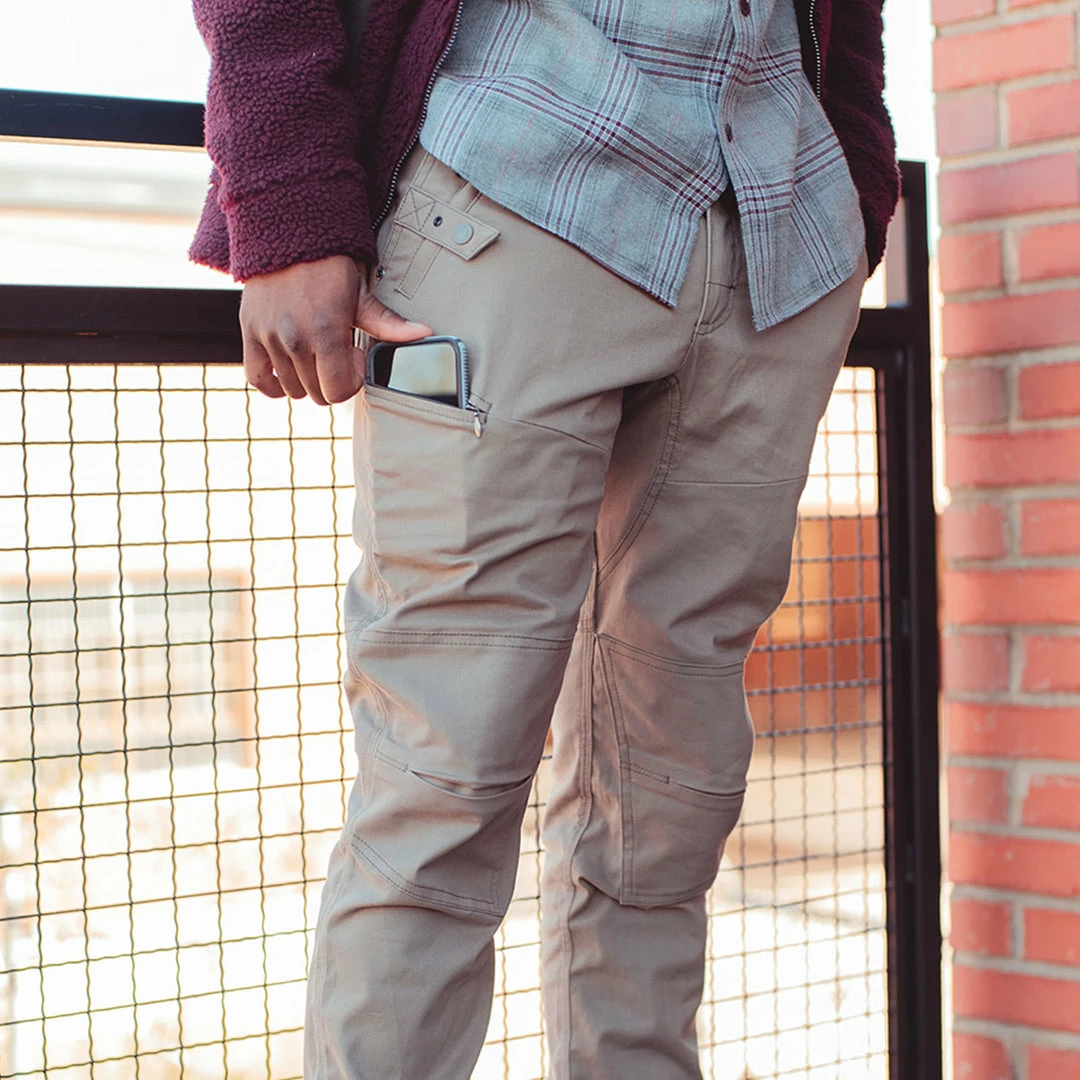 For the man who likes to pack lite, this is the ultimate in versatility. Designed to travel with you and dependable enough to be your only option. Designed for the journey, and ready to go on arrival. This unique and original design features inverted knee gussets and our action gusset crotch for flexibility and comfort. Itโs built with our 6.8-ounce cotton/nylon blend, meaning itโs more durable and has just a hint of stretch. Packed with seven pockets, including three secured by zippers and two secured by snaps, youโre able to carry plenty on your body, and access it fast if needed. In our classic fit this will easily accommodate a hiking boot or sneaker and is built tough with our triple-stitched seams and bar tac reinforcements.ย