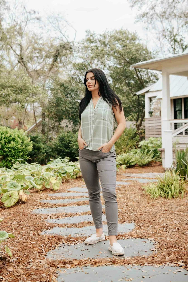 - Model is 5’10” with a 27″ waist and is wearing a size 6